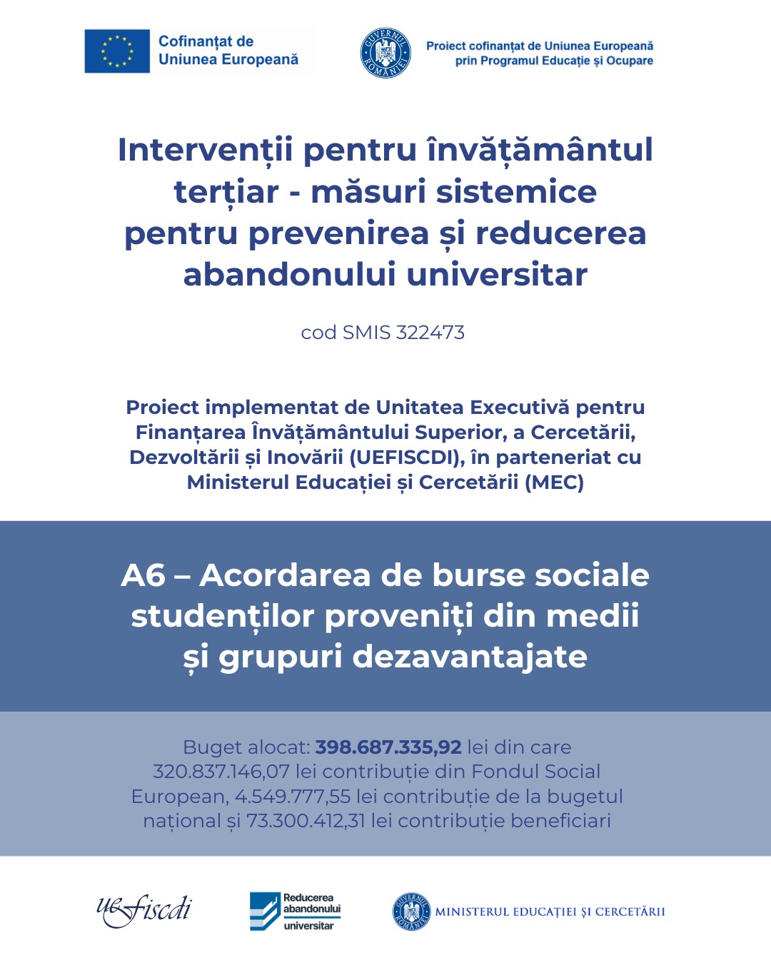 Începând cu 1 ianuarie 2026, Bursele sociale se acordă prin implementarea, la nivel național, a Proiectului „Intervenții pentru învățământul terțiar – măsuri sistemice pentru prevenirea și reducerea abandonului universitar", cod SMIS 322473. Proiectul se va derula în două etape:Informare studenți PEO Echitate_A6